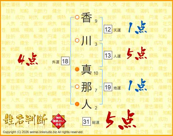 香川真那人さんの人運は13画の5点!