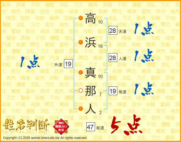 高浜真那人さんの総運は47画の5点!