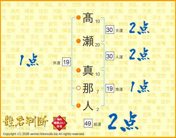 髙(10画)瀬(20画) 真(10画)那(7画)人(2画)