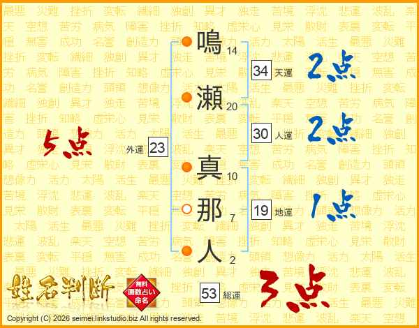 鳴瀬真那人さんの総運は53画の3点!