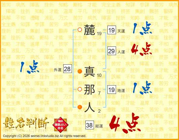生活面を象徴する運勢です。外部から受ける影響力を表し、結婚運、家庭運や職場、環境への順応性を表します。総運から人運を引いた画数。姓や名が1文字の場合を除く。