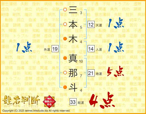 三(3画)本(5画)木(4画) 真(10画)那(7画)斗(4画)
