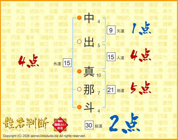 中(4画)出(5画) 真(10画)那(7画)斗(4画)