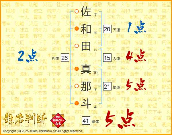 佐(7画)和(8画)田(5画) 真(10画)那(7画)斗(4画)