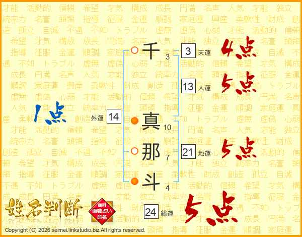 千真那斗さんの人運は13画の5点!
