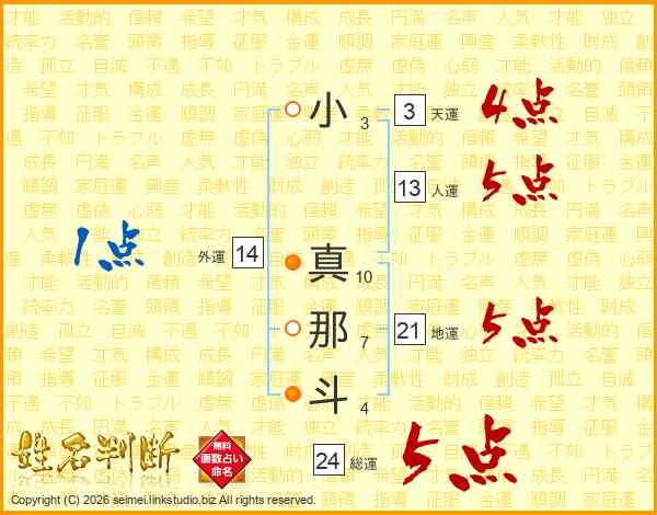 小真那斗さんの人運は13画の5点!