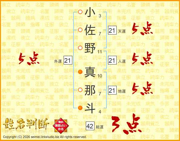 小佐野真那斗さんの天運は21画の5点!