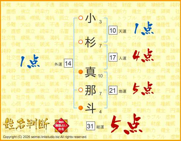 小(3画)杉(7画) 真(10画)那(7画)斗(4画)
