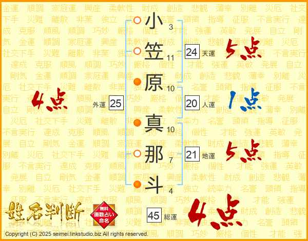 小(3画)笠(11画)原(10画) 真(10画)那(7画)斗(4画)
