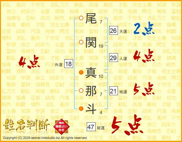尾関真那斗さんの総運は47画の5点!