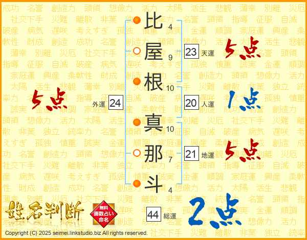 比(4画)屋(9画)根(10画) 真(10画)那(7画)斗(4画)