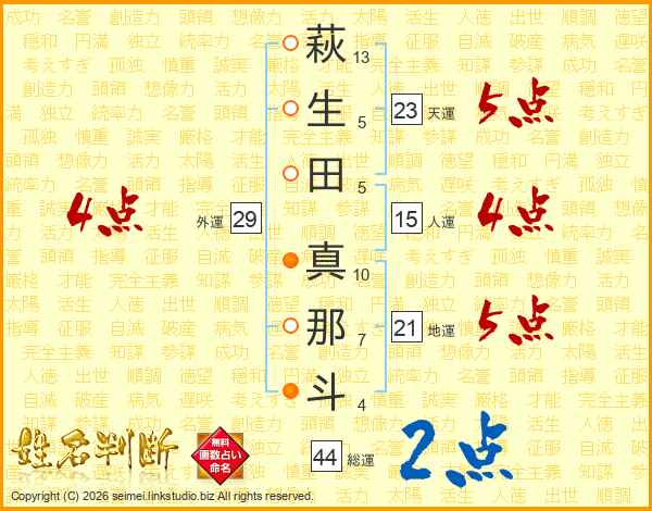 萩生田真那斗さんの総運は44画の2点!