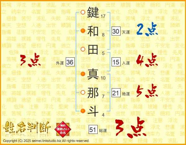 鍵(17画)和(8画)田(5画) 真(10画)那(7画)斗(4画)