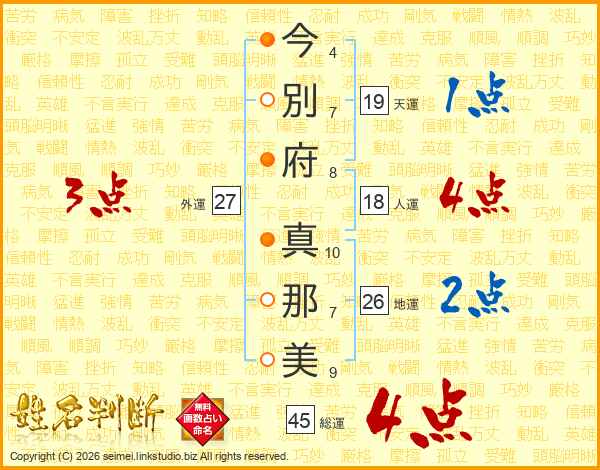 今(4画)別(7画)府(8画) 真(10画)那(7画)美(9画)