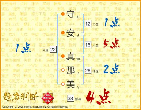 守(6画)安(6画) 真(10画)那(7画)美(9画)