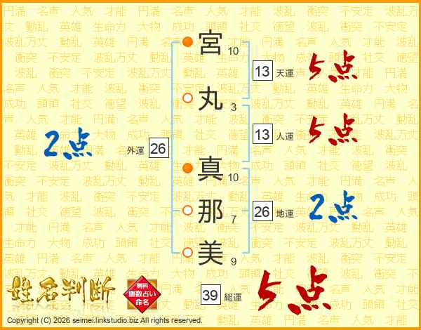 宮(10画)丸(3画) 真(10画)那(7画)美(9画)