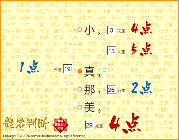 生活面を象徴する運勢です。外部から受ける影響力を表し、結婚運、家庭運や職場、環境への順応性を表します。総運から人運を引いた画数。姓や名が1文字の場合を除く。