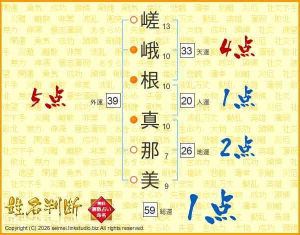 嵯(13画)峨(10画)根(10画) 真(10画)那(7画)美(9画)