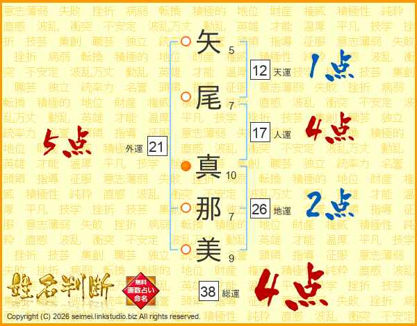 矢(5画)尾(7画) 真(10画)那(7画)美(9画)