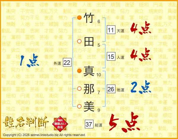 竹田真那美さんの総運は37画の5点!