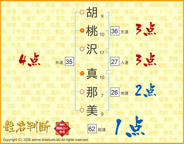 胡(9画)桃(10画)沢(17画) 真(10画)那(7画)美(9画)