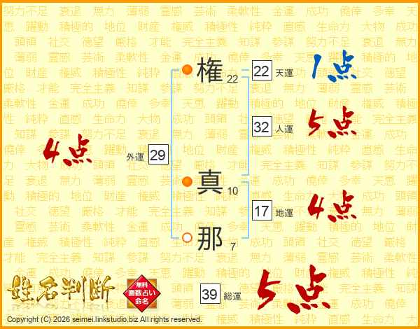 生活面を象徴する運勢です。外部から受ける影響力を表し、結婚運、家庭運や職場、環境への順応性を表します。総運から人運を引いた画数。姓や名が1文字の場合を除く。