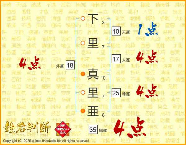 下里真里亜さんの地運は25画の4点!