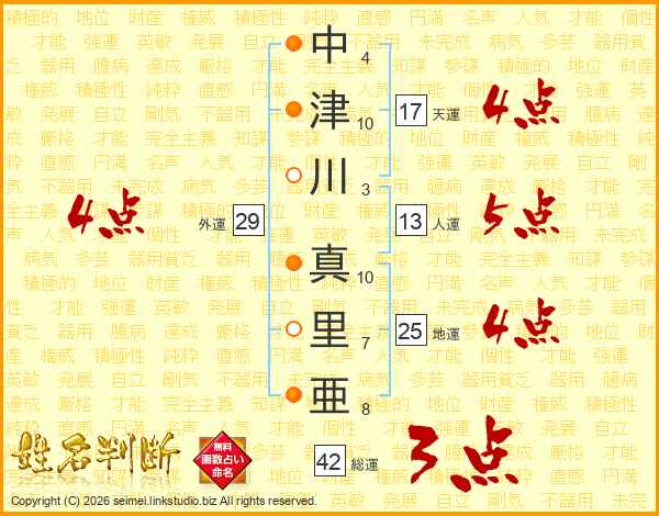 中(4画)津(10画)川(3画) 真(10画)里(7画)亜(8画)