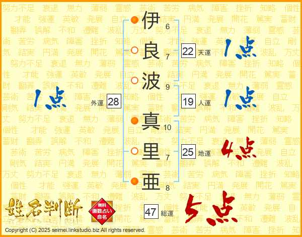 伊(6画)良(7画)波(9画) 真(10画)里(7画)亜(8画)