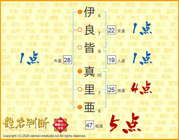 伊(6画)良(7画)皆(9画) 真(10画)里(7画)亜(8画)