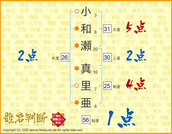 小和瀬真里亜さんの天運は31画の5点!