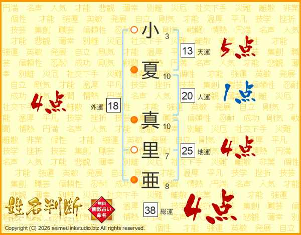 小夏真里亜さんの総運は38画の4点!