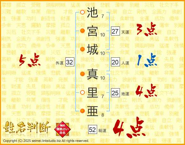 池(7画)宮(10画)城(10画) 真(10画)里(7画)亜(8画)