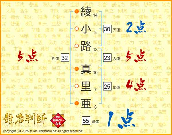 綾(14画)小(3画)路(13画) 真(10画)里(7画)亜(8画)