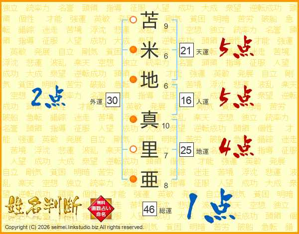 苫(9画)米(6画)地(6画) 真(10画)里(7画)亜(8画)