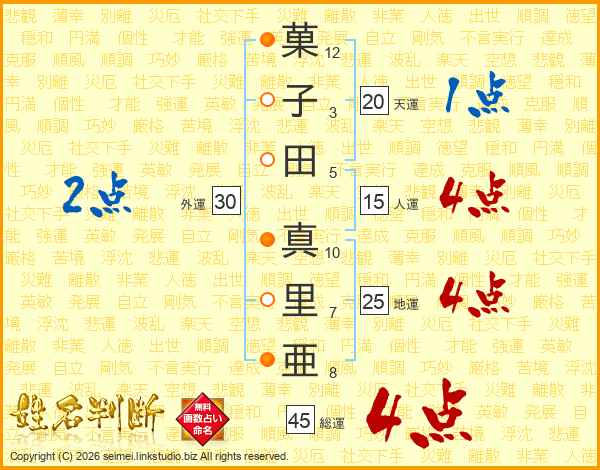 菓(12画)子(3画)田(5画) 真(10画)里(7画)亜(8画)