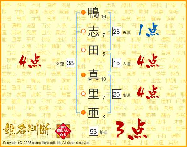 鴨(16画)志(7画)田(5画) 真(10画)里(7画)亜(8画)