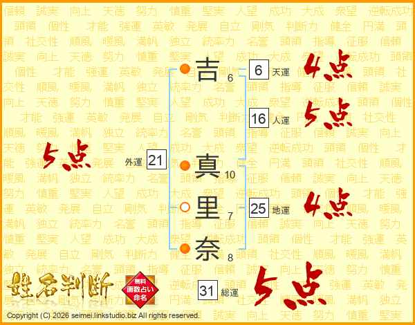 吉(6画) 真(10画)里(7画)奈(8画)
