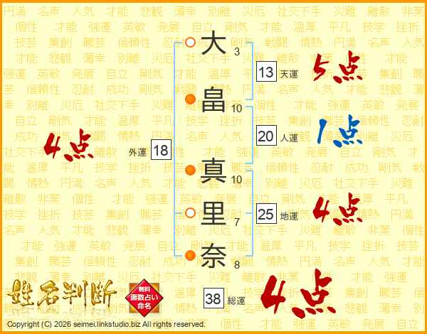 大(3画)畠(10画) 真(10画)里(7画)奈(8画)