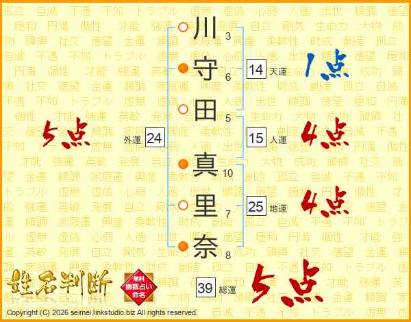 川(3画)守(6画)田(5画) 真(10画)里(7画)奈(8画)