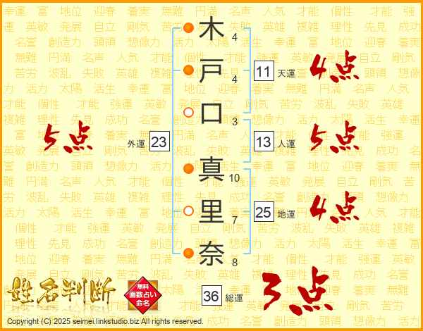 木(4画)戸(4画)口(3画) 真(10画)里(7画)奈(8画)