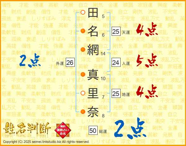 田(5画)名(6画)網(14画) 真(10画)里(7画)奈(8画)
