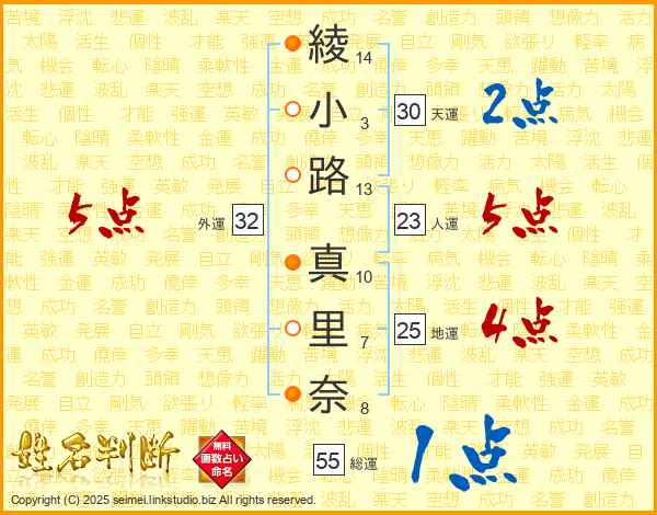 綾(14画)小(3画)路(13画) 真(10画)里(7画)奈(8画)