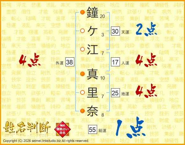 鐘ケ江真里奈さんの外運は38画の4点!