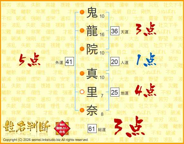 鬼(10画)龍(16画)院(10画) 真(10画)里(7画)奈(8画)