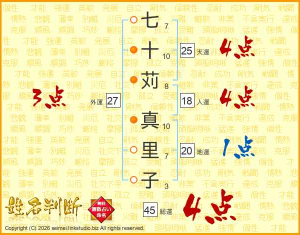 七十苅真里子さんの天運は25画の4点!