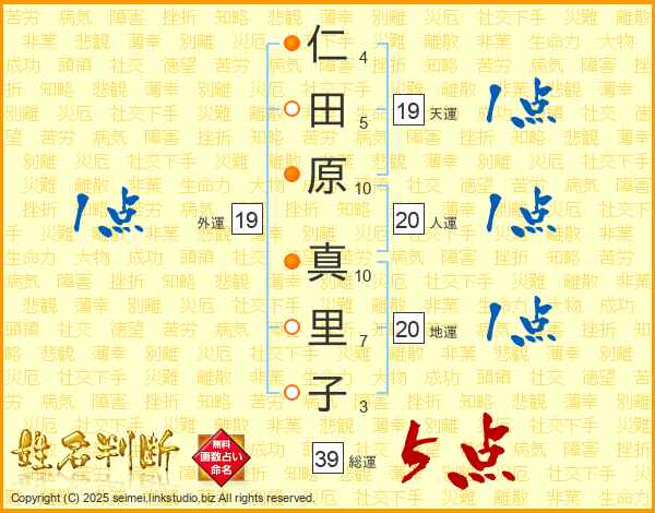 仁(4画)田(5画)原(10画) 真(10画)里(7画)子(3画)