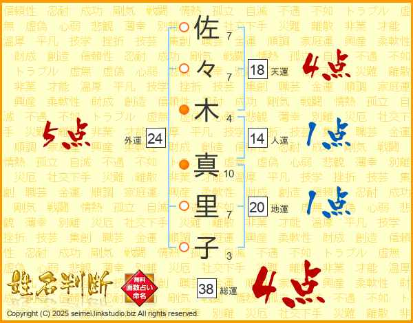 佐々木真里子さんの総運は38画の4点!