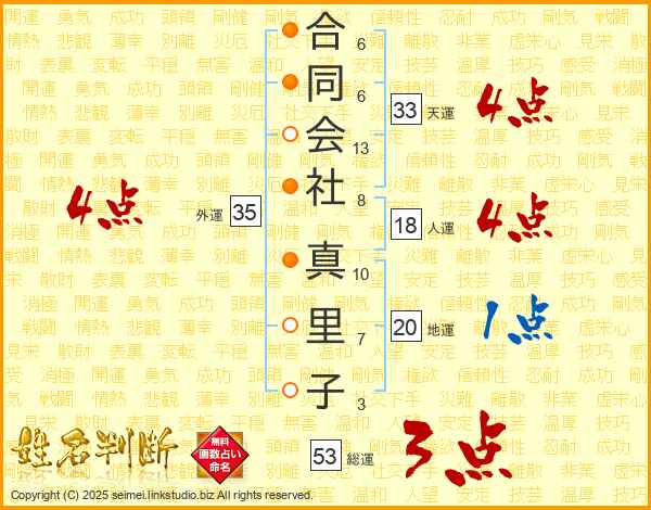 合(6画)同(6画)会(13画)社(8画) 真(10画)里(7画)子(3画)