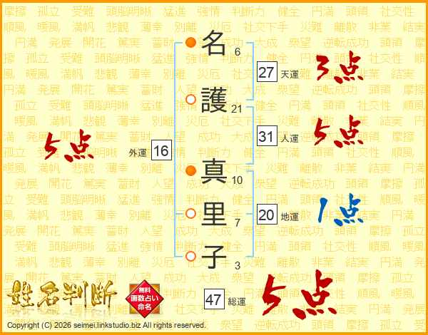 名(6画)護(21画) 真(10画)里(7画)子(3画)